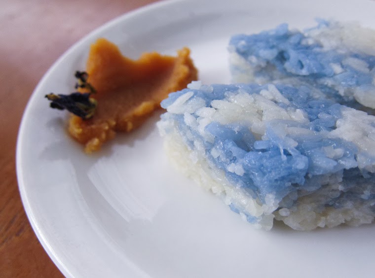First, these blue glutinous rice cakes, made with steamed glutinous rice, flavoured with coconut milk and coloured with homemade dye from blue butterfly pea flower. Some people call these cakes "pulut tai tai", which, I don't know, translates into "lady rice" or something like that. They are also referred to as "kuih kaya", because they are eaten with generous dabs of kaya, a coconut jam (or perhaps more accurately, caramelized coconut curd). In my family, we know it as "kah tak kueh", which means "foot-stomped cake", as the cooked rice grains are traditionally compressed into cake form by literally stepping on them - I think something like banana leaves are layered over so the feet doesn't come in direct contact with the goods, ha. When my dad makes this, he just presses it with his hands, and weighs it down with heavy books. One day, though, I reckon it would be fun if we tried making it with the old-school technique!